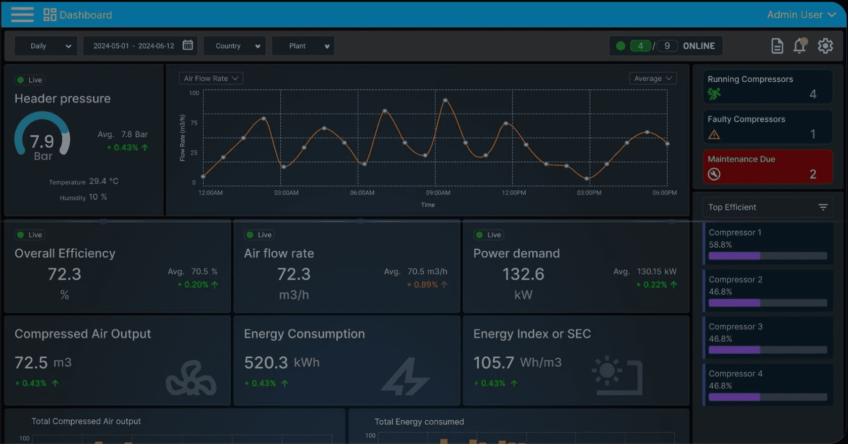 Suivi instantané de vos compresseurs (pression, température, consommation, état).